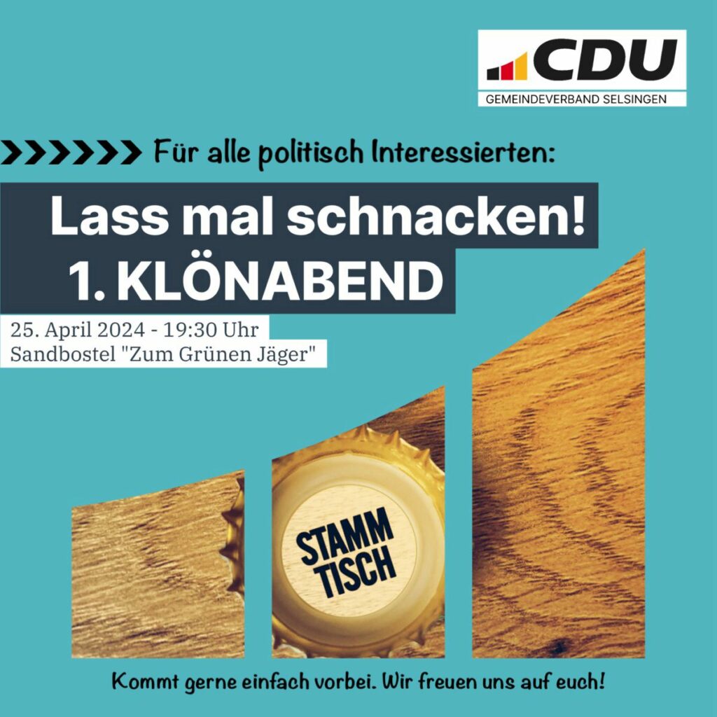 Für alle politisch Interessierten starten wir mit einem neuen Format: Der erste „Lass mal schnacken“ Klönabend in der Samtgemeinde Selsingen! Ihr seid herzlich eingeladen am 25.April 2024 um 19:30 Uhr in Sandbostel im Gasthof „Zum Grünen Jäger“ dabei zu sein. Wir freuen uns auf einen interessanten Austausch in lockerer Runde mit euch!